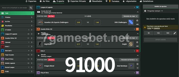 O 91000 oferece uma grande seleção de opções de apostas em e-sports com probabilidades competitivas